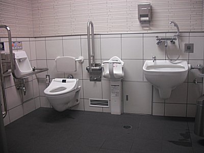 まずは恒例?のトイレチェック、改札口内に車椅子・オストメイト対応フル規格トイレが設置されていました。 |